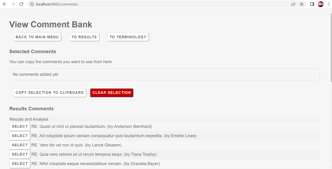 University Assignment: Developed a comment bank that stored markers comments, used by education staff to speed up the process of giving feedback, made using Laravel (PHP) and MySQL.