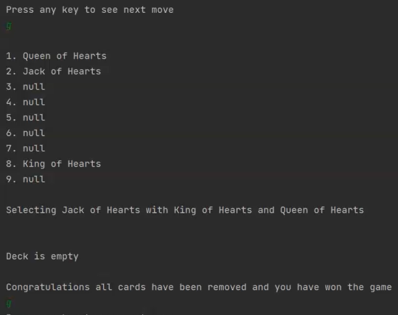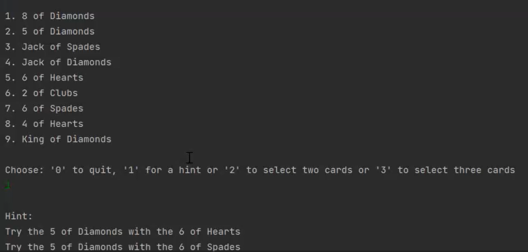 University Assignment: An elevens card game in Java. A card game of elevens is where the user must 2 get cards that equal 11 or 3 cards that equal King, Queen and Jack to remove them, the game ends when there are no cards left in the hand or deck. Each game has a deck of cards, then shuffles the deck, randomly pushing cards into a stack, then a hand of 9 cards is selected.