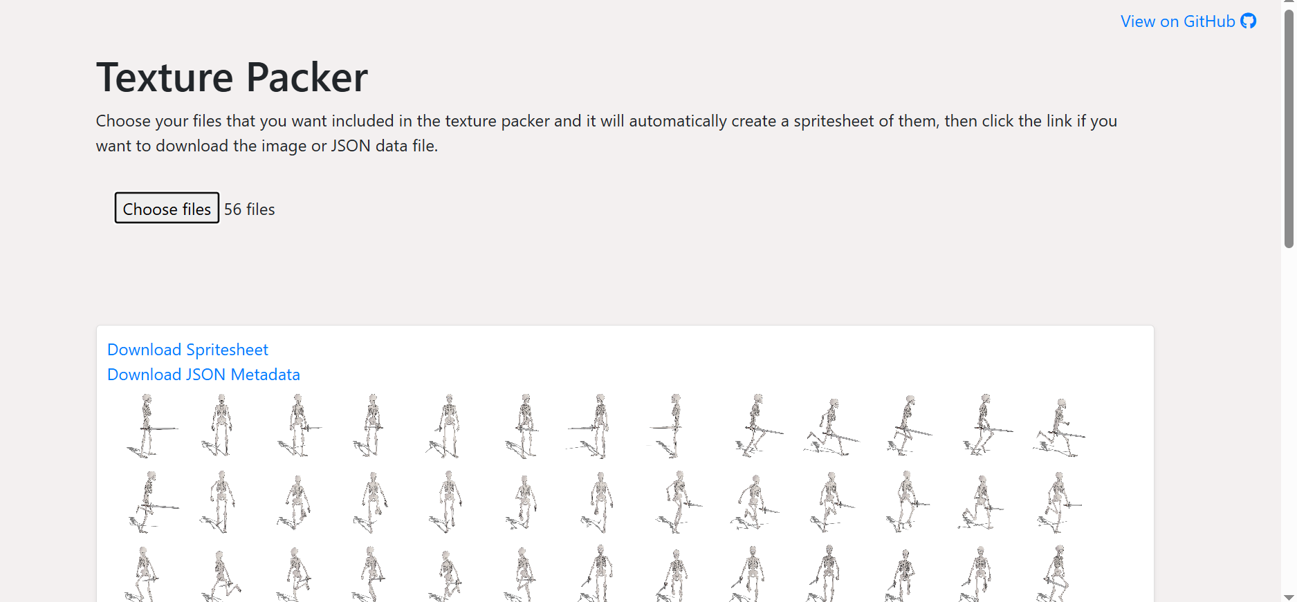 A javascript website for making spritesheets, allows you to select multiple files and then download the completed spritesheet and JSON data file.