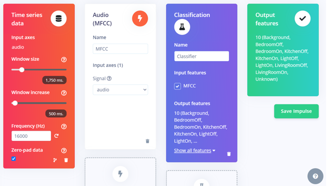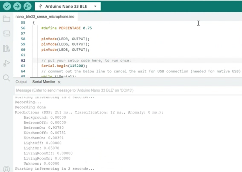 University Assignment: A C++ machine learning model for controlling lights through voice commands using a Arduino Nano 33 BLE Sense and Edge Impulse to train and compile the model. Trained model on audio collected manually through the Arduino mic. Downloaded model on to Arduino, modified Arduino code so that it would light up different LEDs depending on which words were detected, tested model and it worked well.